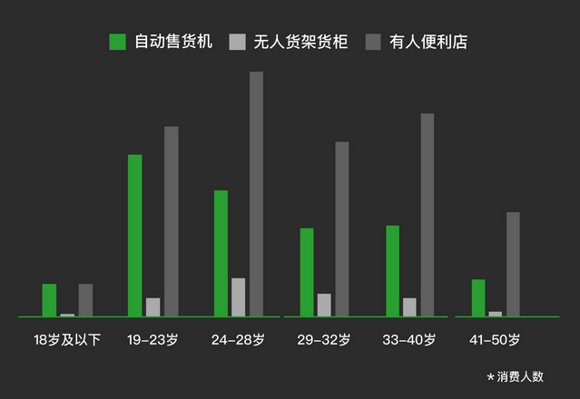 相較于傳統零售店,用戶群體的年齡分布差異更加顯著,偏向傳統便利店的普遍在30-40歲之間。自動售貨機的消費主力群體年齡段主要集中在 95后,未來購買力的主力軍,而且在30歲左右年齡段消費群體中也有一定的比重。